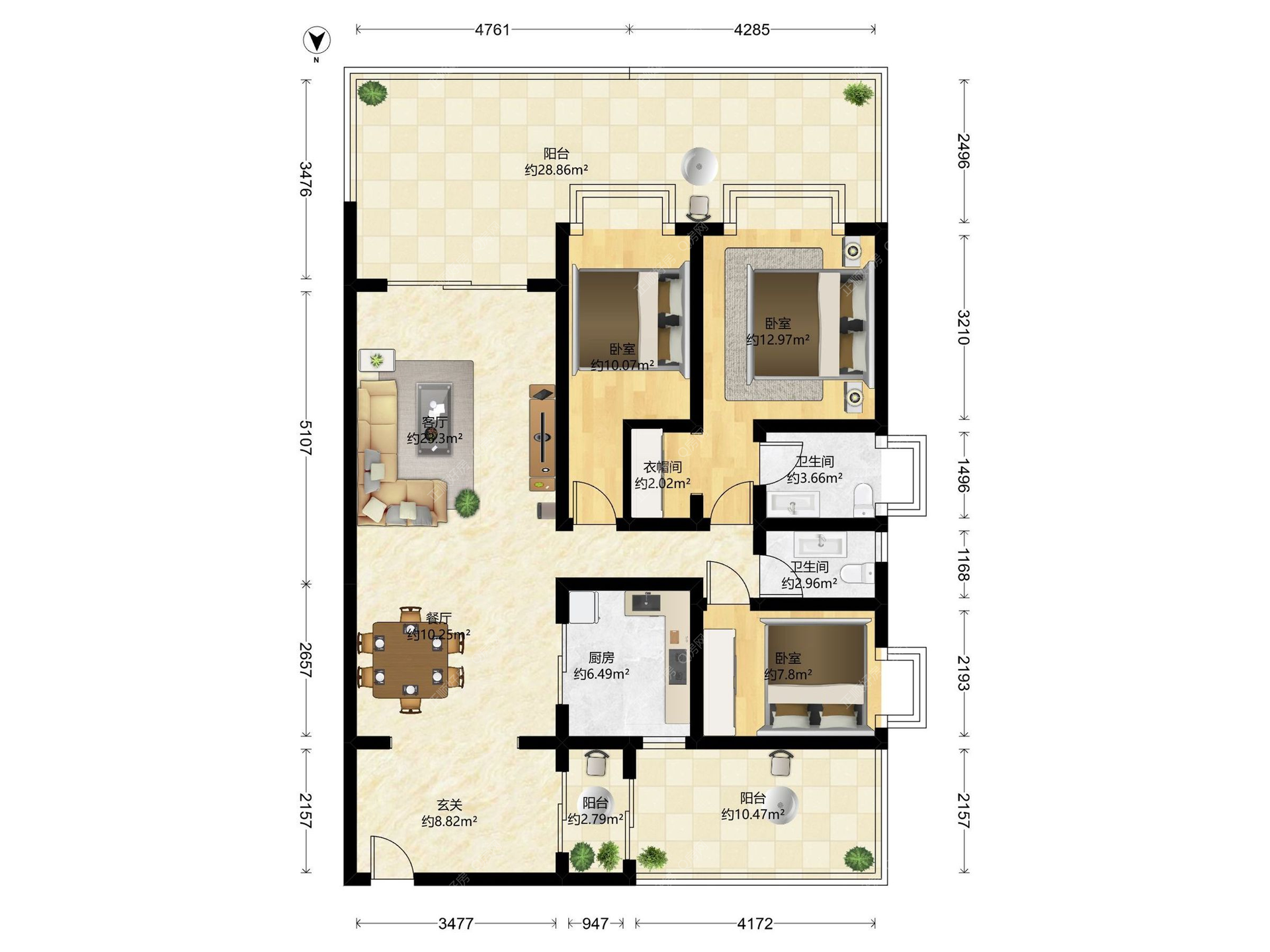 3房2厅2卫 | 128.82 ㎡ | 南北